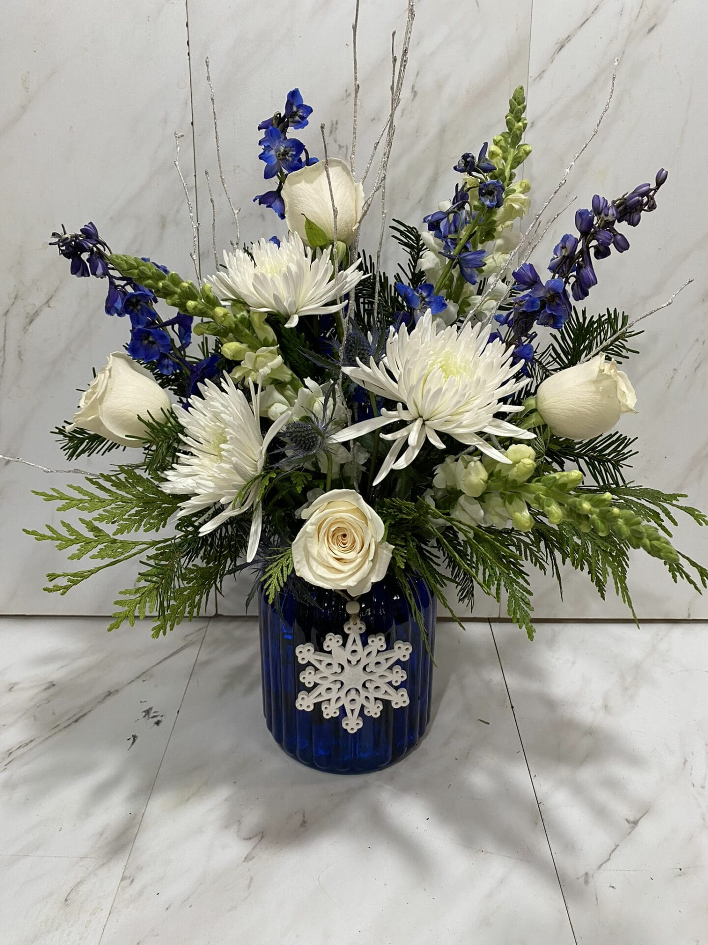A large arrangement in a blue glass vase with a snowflake dangler. This design is a beautiful mix of winter greenery, snapdragons, blue delphnium, blue thistles, white/silver sticks, white spider mums, and white roses.