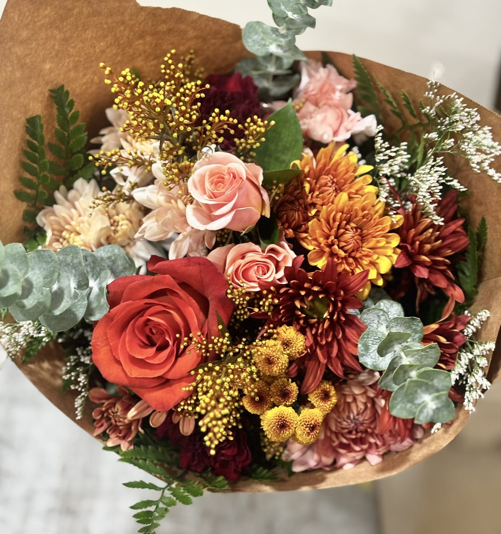 This month’s featured bouquet is a Thanksgiving color scheme of long lasting flowers with warm fall elements within to send those November vibes to someone special! As always, the bouquet of the month is also offered at a discounted price of $40.00, and valued at $50. This is a wrapped bouquet, ready to place within a vase (vase is not included).