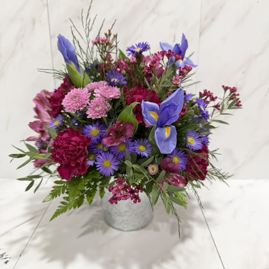 A garden styled arrangement with shades of purples throughout within a galvanized tin container.